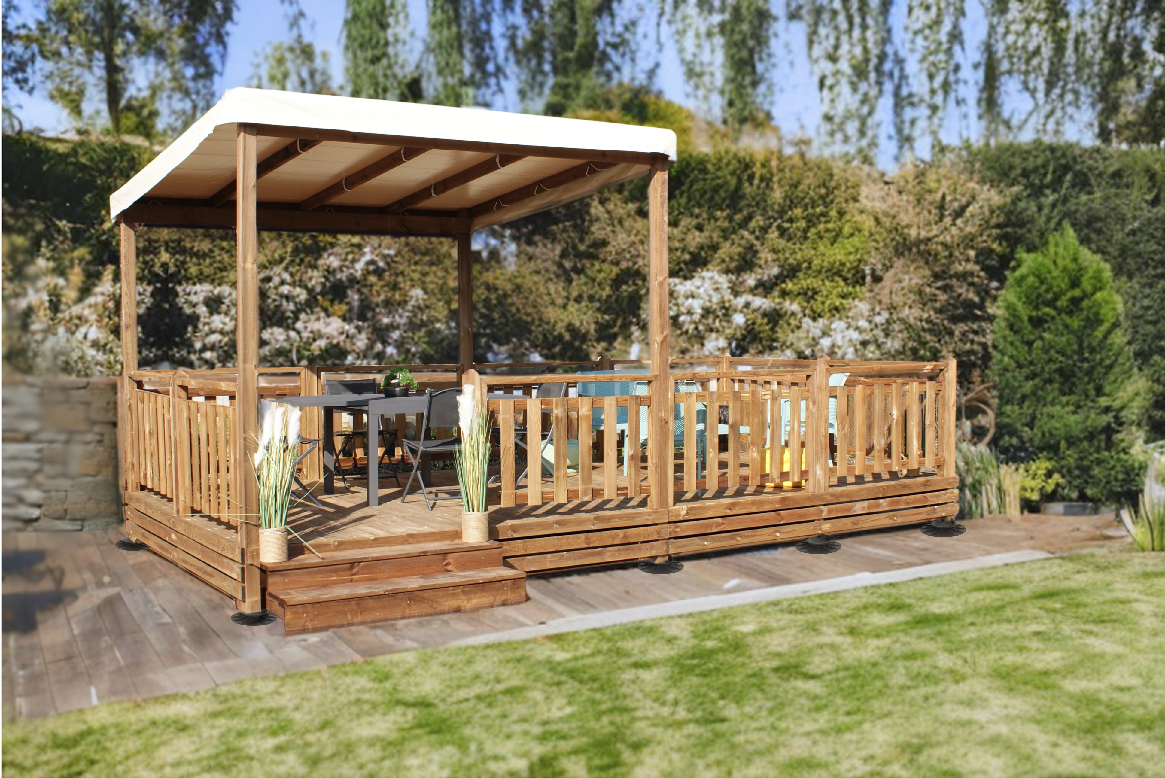 Ce kit terrasse prêt à poser avec sa pergola bois en kit et bâche pvc haute qualité est disponible en quatre dimensions avec différentes configurations pour s'adapter parfaitement à votre terrain et à vos exigences. Il vous offrira un espace idéal pour ajouter une pièce extérieure à votre maison, sans travaux de terrassement coûteux, pour un montage rapide sans préparation lourde : cet espace de vie esthétique, pratique et fonctionnel est simple et rapide à monter grâce à ses éléments pré-coupés, pré-percés et numérotés pour un assemblage à l'instar de n'importe quel meuble en kit. Le montage est expliqué dans la notice fournie, simple et détaillée étape par étape. Vous recevez par transporteur tous les éléments ainsi que la visserie de qualité professionnelle. Ainsi, vous pouvez construire votre terrasse vous-même facilement.