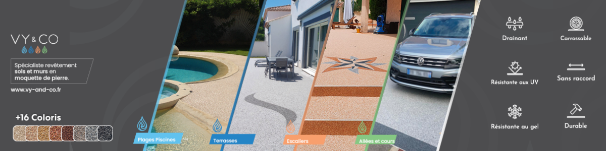 Notre produit phare, la VY-STONE, est une moquette de pierre composée d'agrégats de marbre et de pierre naturelle liés par une résine hautes performances fabriquée en France. Résistante, drainante et sans joints, elle apporte une touche élégante et intemporelle à vos terrasses, allées, plages de piscine et espaces paysagers.