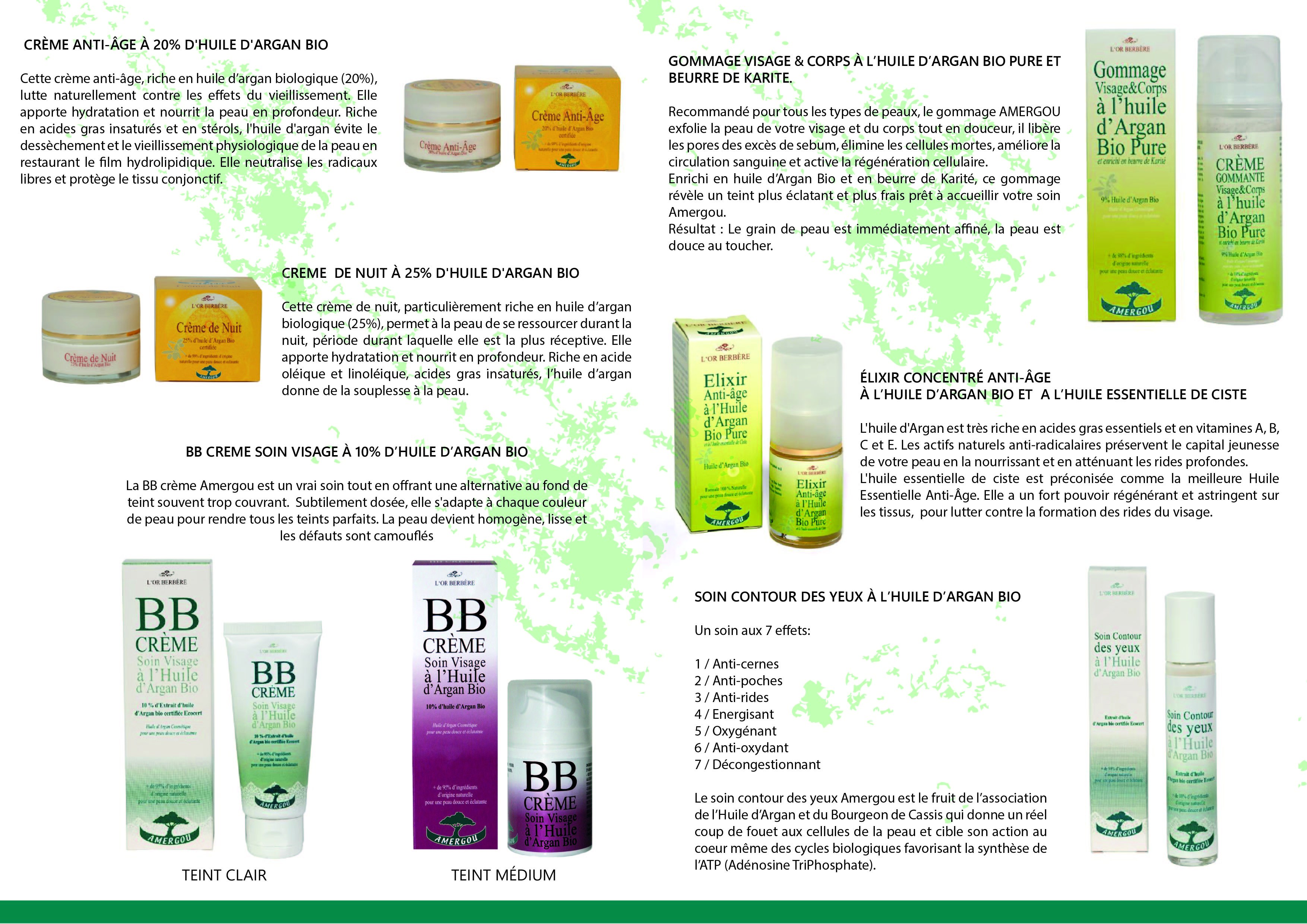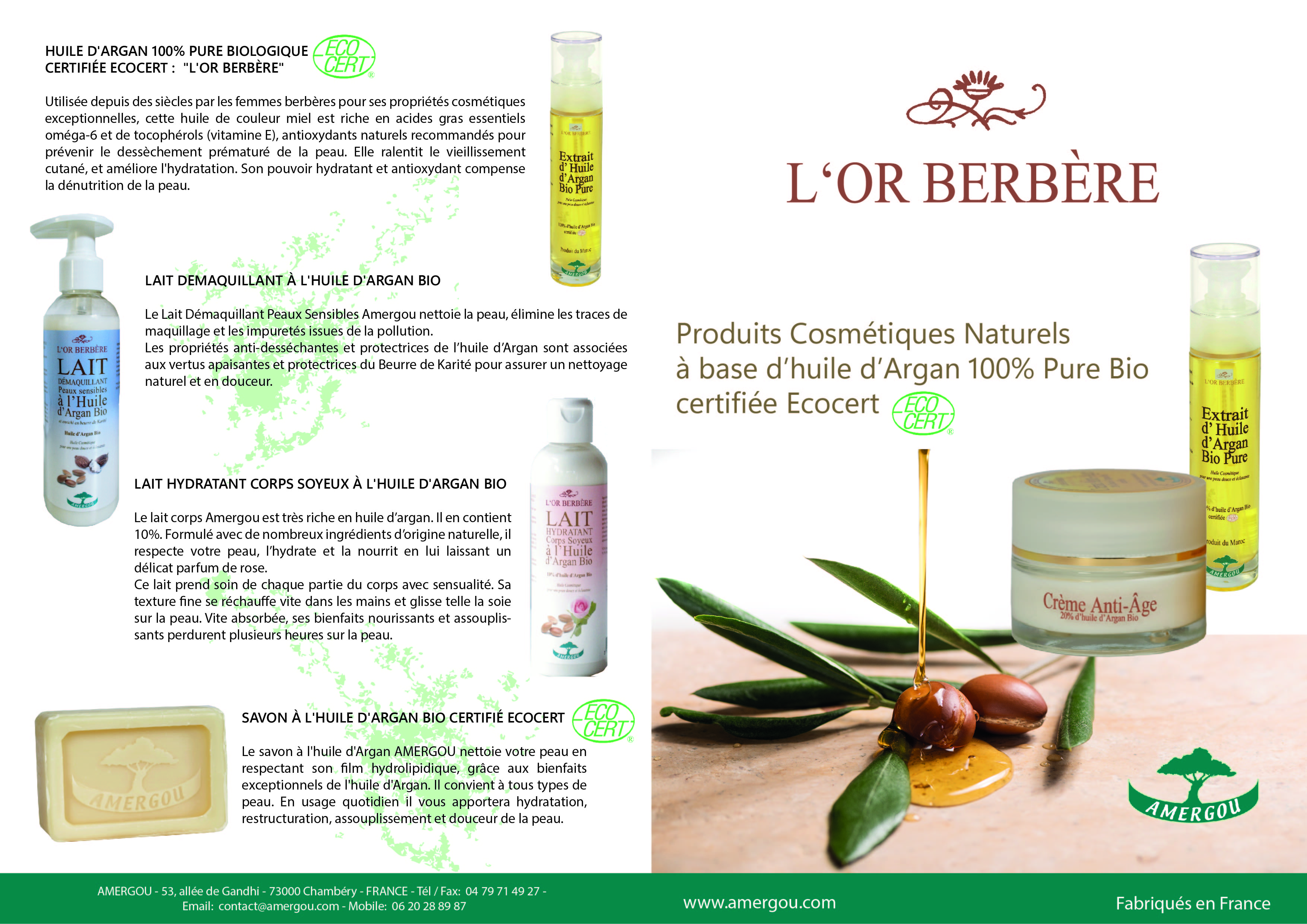 -Produits cosmétiques hautement concentrés en huile d'Argan Bio certifiée Ecocert ; nos produits sont fabriqués en France.